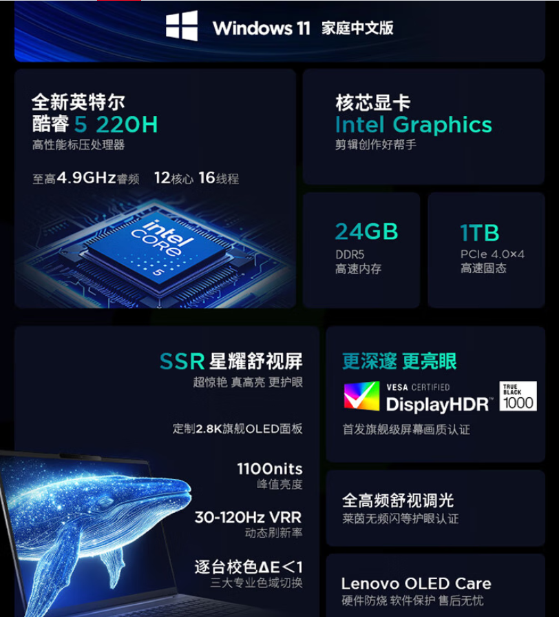 商品名称:联想笔记本电脑小新Pro16 超能本2025 高性能轻薄本 酷睿5 220H 24G 1T 2.8K高刷OLED