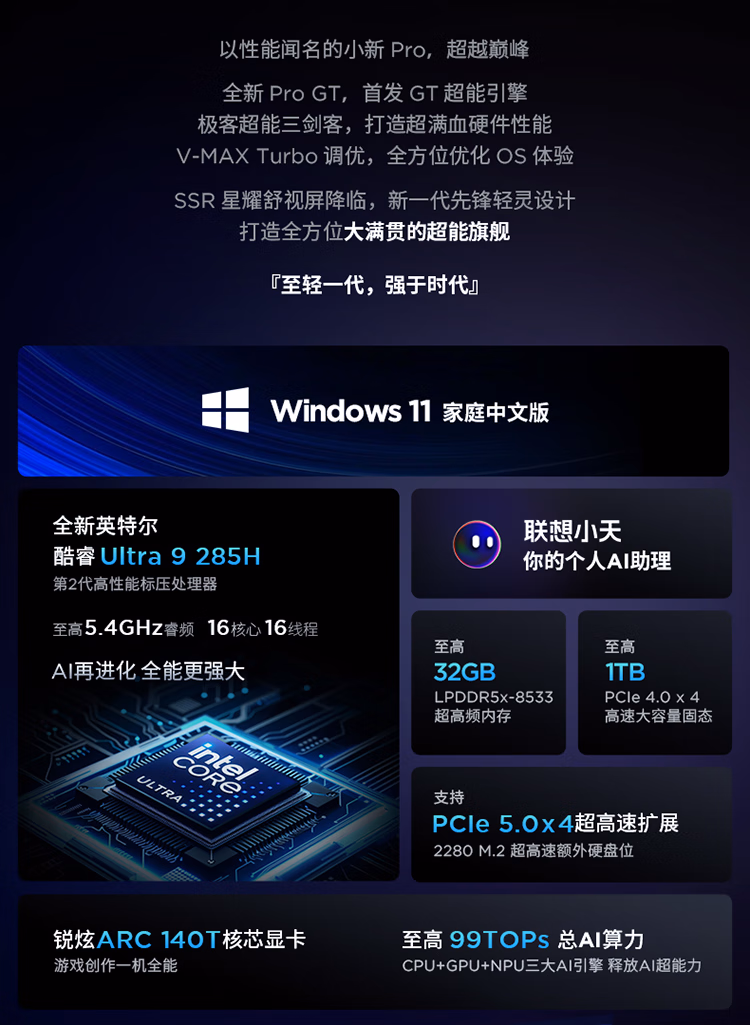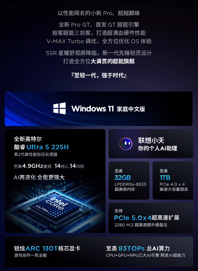 商品名称:小新Pro16GT AI元启版 小新Pro 16 IAH10GRXULT532G1TB11C(Ultra5 225H)
