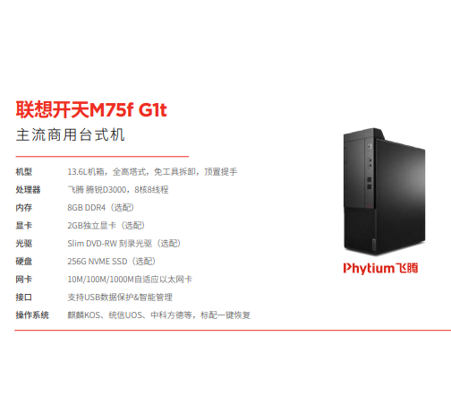 商品名称:开天M75f G1t-D019 飞腾D3000 16GB 1TB+512GB GT1020 2GB 无光驱 银河麒麟试用版(国产)