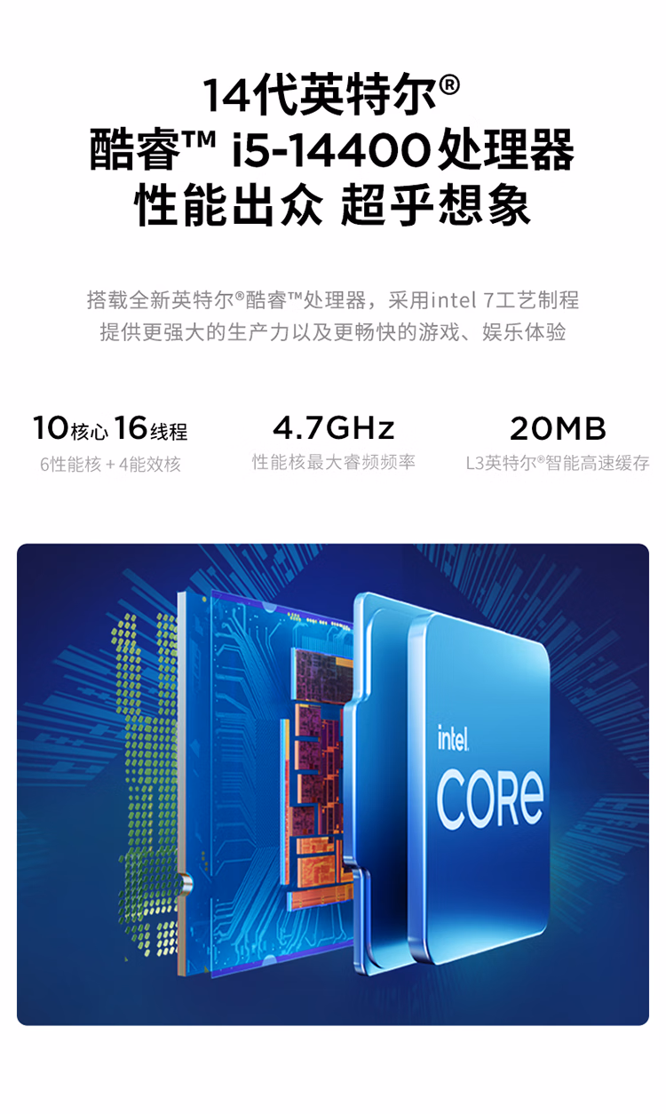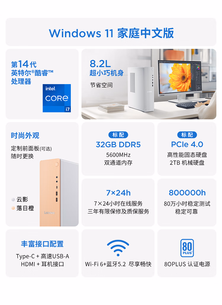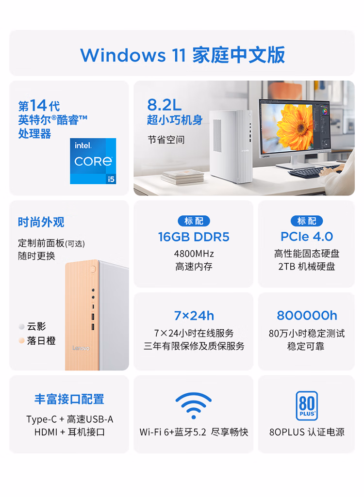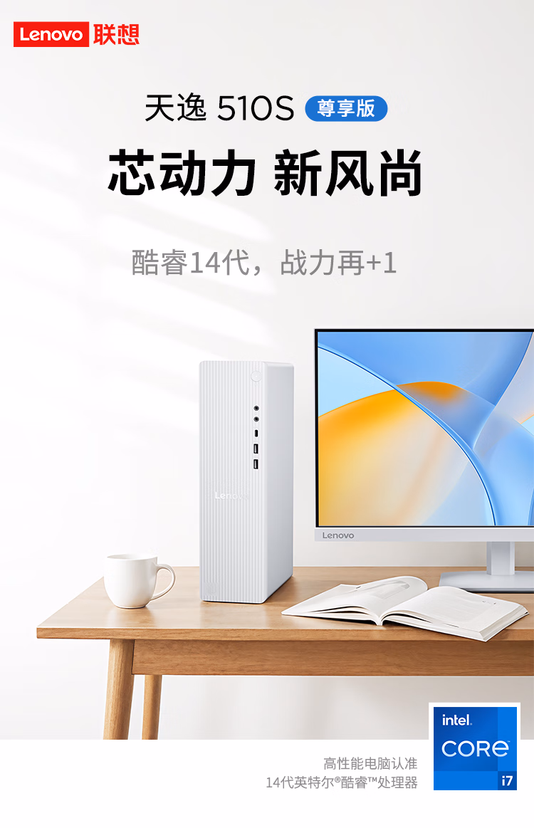商品名称:天逸510S-08IRR CORE_I3-14100/8GB DDR5 4800 UDIMM/512GB M.2 PCIe 4.0 SSD/集成显卡/WIFI6_2X2AX+BT_MOW/蓝牙/无光驱/无读卡器/USB黑色键鼠/三年有限保修